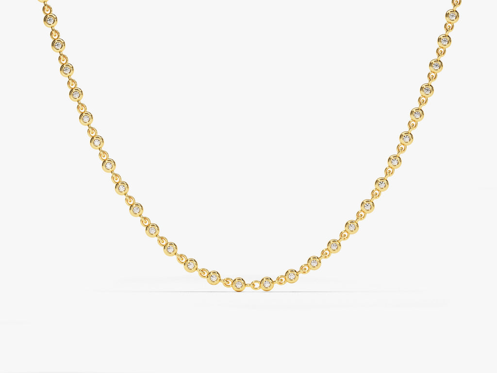 Delicate and refined, this 1.30 mm Bezel Diamond Tennis Necklace is set in luxurious 14k gold. Each diamond is encased in a sleek bezel setting, offering a modern twist on a classic design. Perfect for adding a subtle touch of sparkle to everyday outfits or for layering with other pieces.