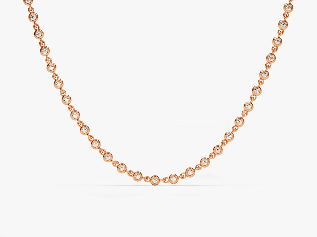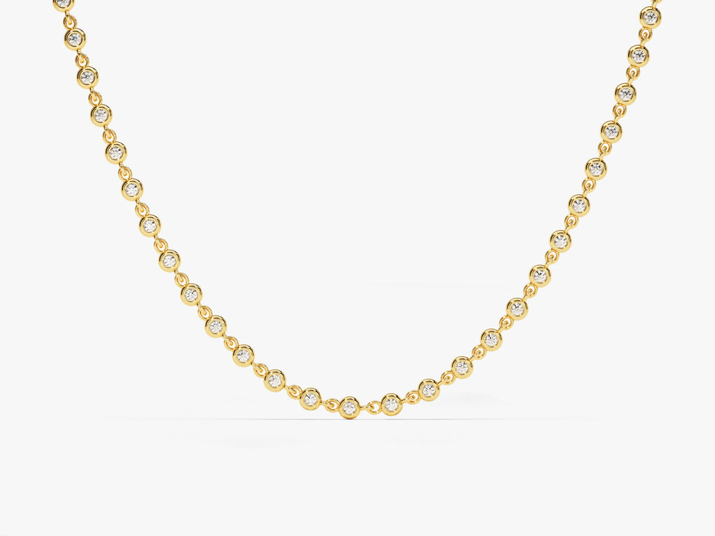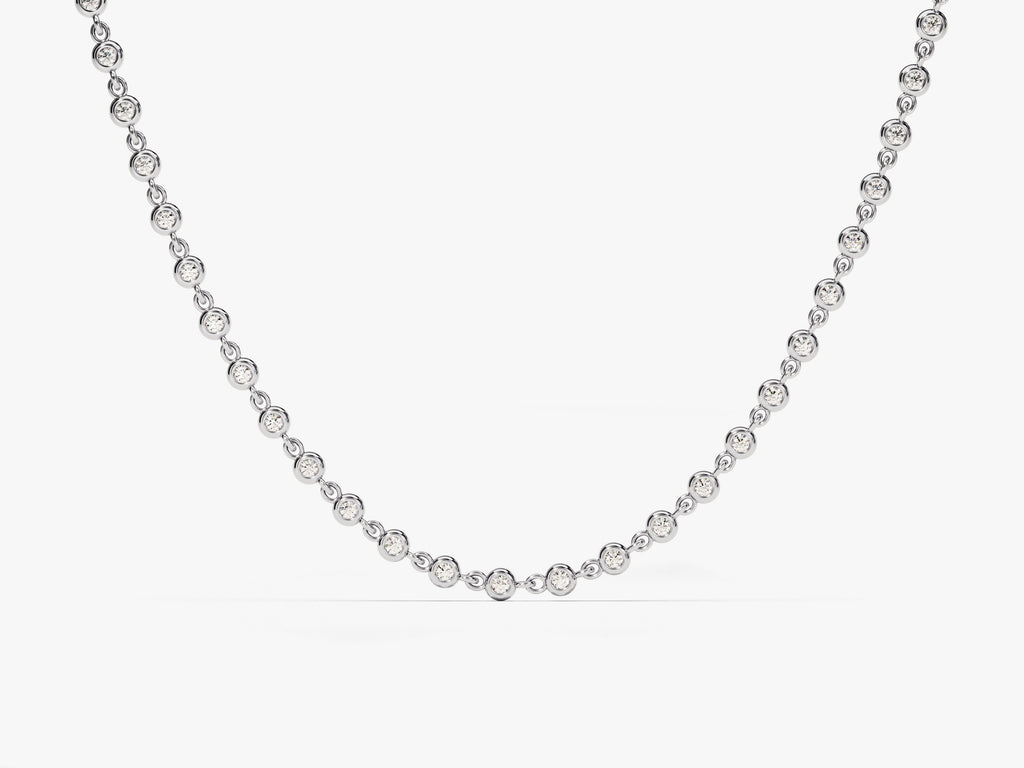 The Bezel Moissanite Tennis Necklace is an elegant jewelry piece featuring moissanite stones with a diameter of 1.70 millimeters, securely set in bezel settings. The bezel setting adds a modern touch, providing both security and a sleek aesthetic. The continuous arrangement of these moissanite stones along the necklace creates a classic and sophisticated look, making it suitable for various occasions.