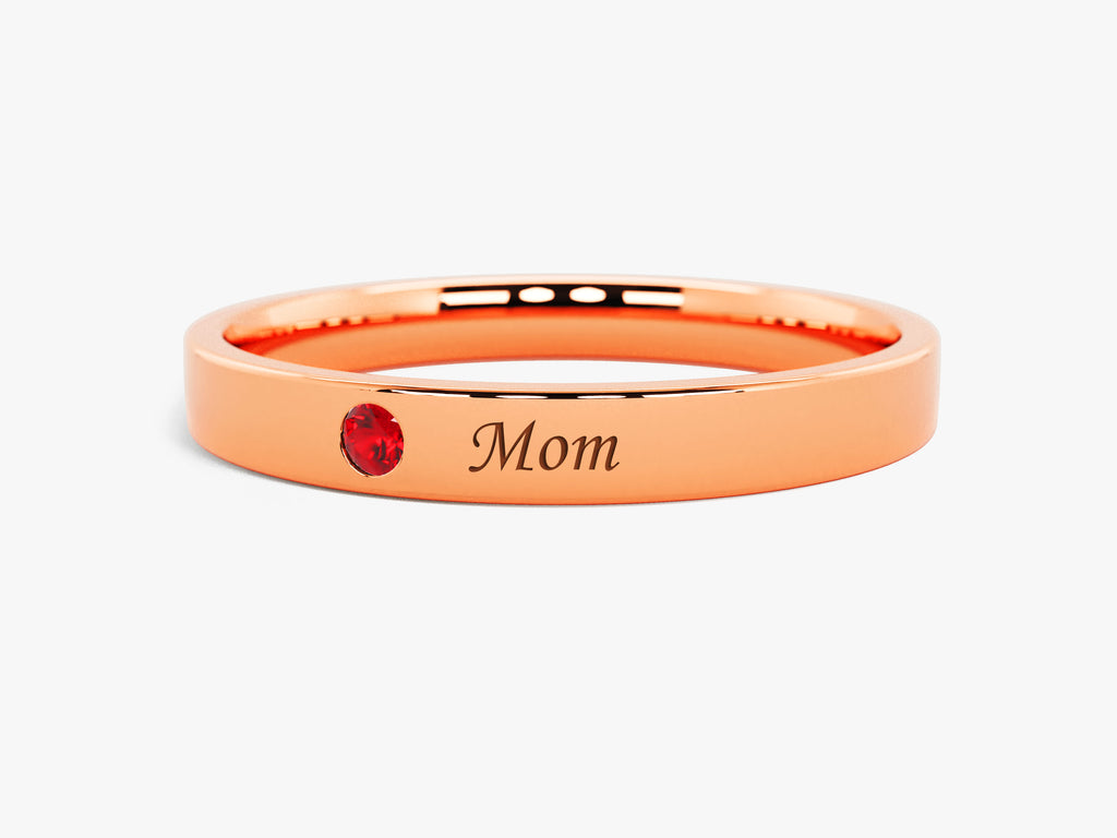 Celebrate the essence of motherhood with our enchanting mom birthstone ring featuring the exquisite 'Mom' engraving. Available in radiant yellow gold, sleek white gold, or romantic rose gold, and offered in both 14k and 18k options, each piece in this collection is a testament to the enduring bond between mother and child. Adorned with a shimmering flush-set diamond beside the heartfelt inscription, these rings are timeless treasures, perfect for honoring the infinite love and warmth of maternal devotion. Celebrate Mother's Day with the perfect gift for your mom.