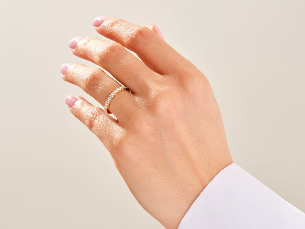 Sparkle halfway around with this delicate and versatile classic. Our half eternity diamond wedding band offers remarkable sparkle with shimmering diamonds adorning half the band. It is styled perfectly to complement any engagement ring design, stack with other rings or stand out on its own.