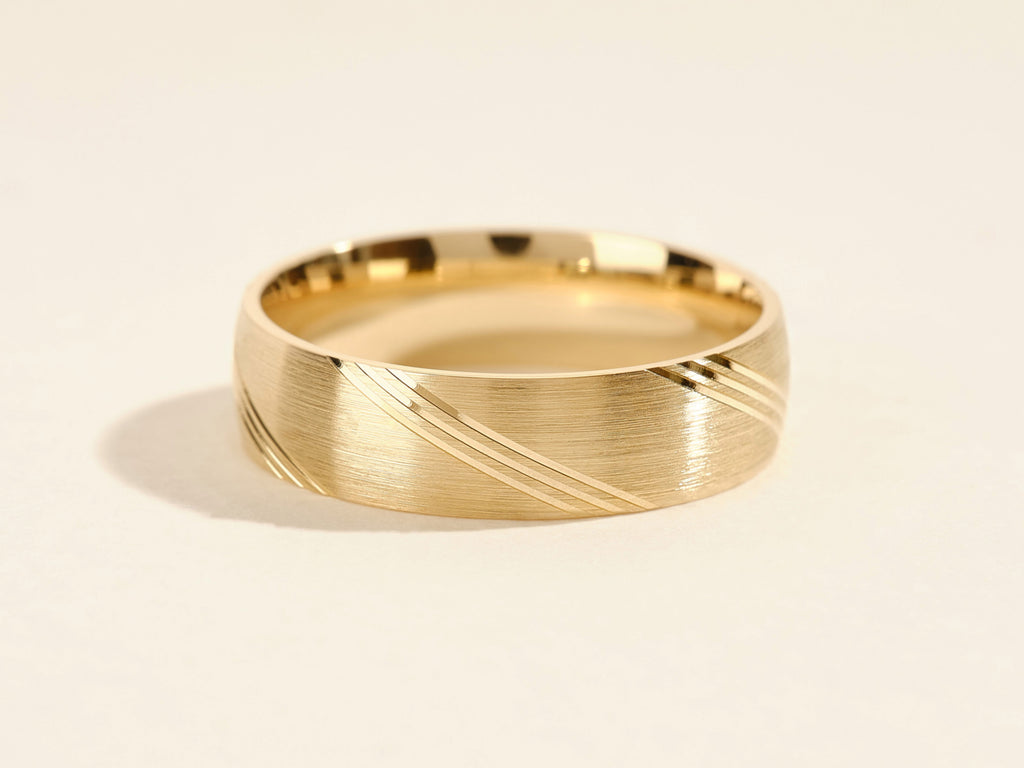 This gold wedding band is the perfect statement piece for your collection. It's lined with diagonal lines that add an extra touch of sophistication and style. A subtle diagonal lining enhances the appearance and makes it look even more elegant. The ring is crafted of solid gold.