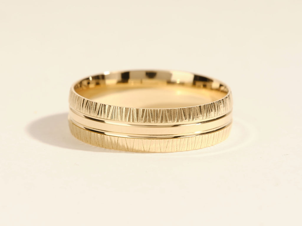 This Grooved Fancy Accents Men's Gold Wedding Band has a classic style that is sure to please! The band has rounded edges and an accented finish, giving it the look of elegance and sophistication.