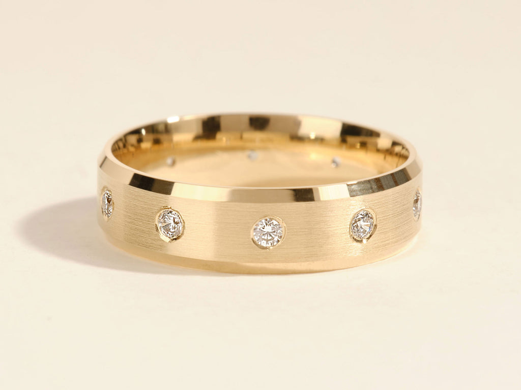 The ultimate in luxury, this men's wedding band is crafted in sleek and contemporary brushed solid gold. A gorgeous 6mm beveled edge creates a comfortable fit while being enhanced by the warm sparkle of ten round brilliant diamonds.