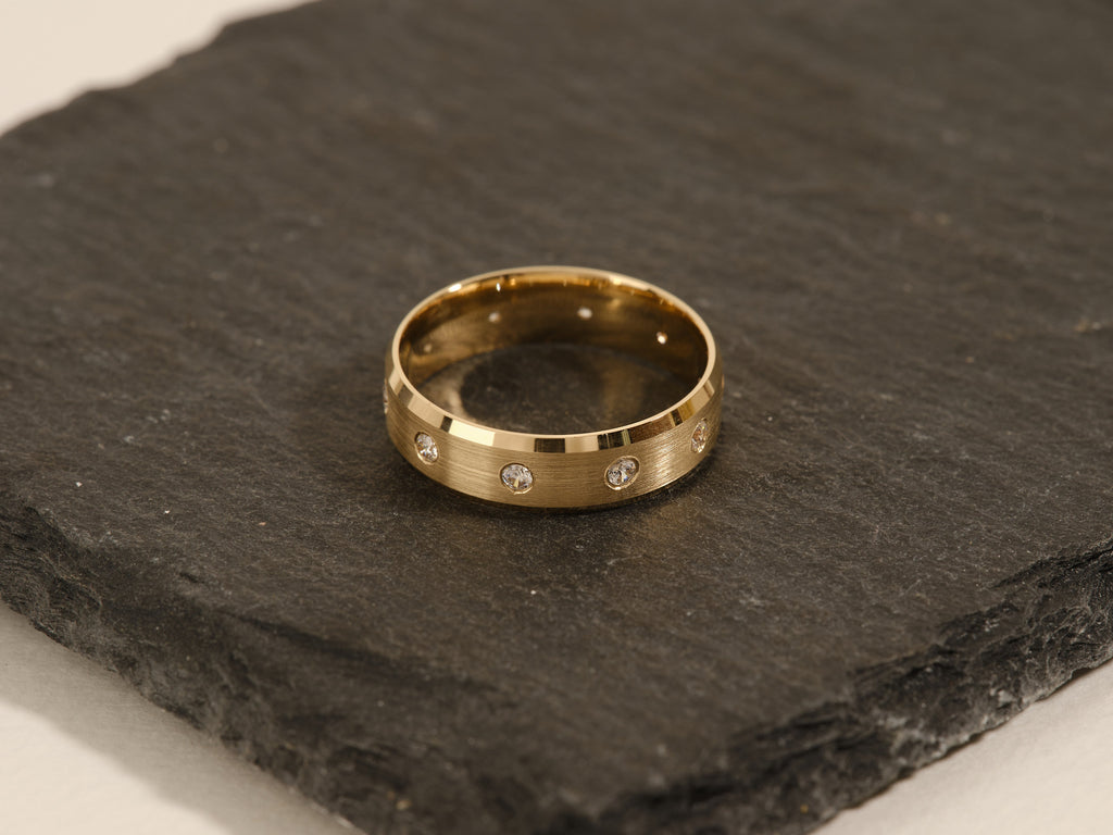 The ultimate in luxury, this men's engagement ring is crafted in sleek and contemporary brushed solid gold. A gorgeous 6mm beveled edge creates a comfortable fit while being enhanced by the warm sparkle of ten round brilliant diamonds.