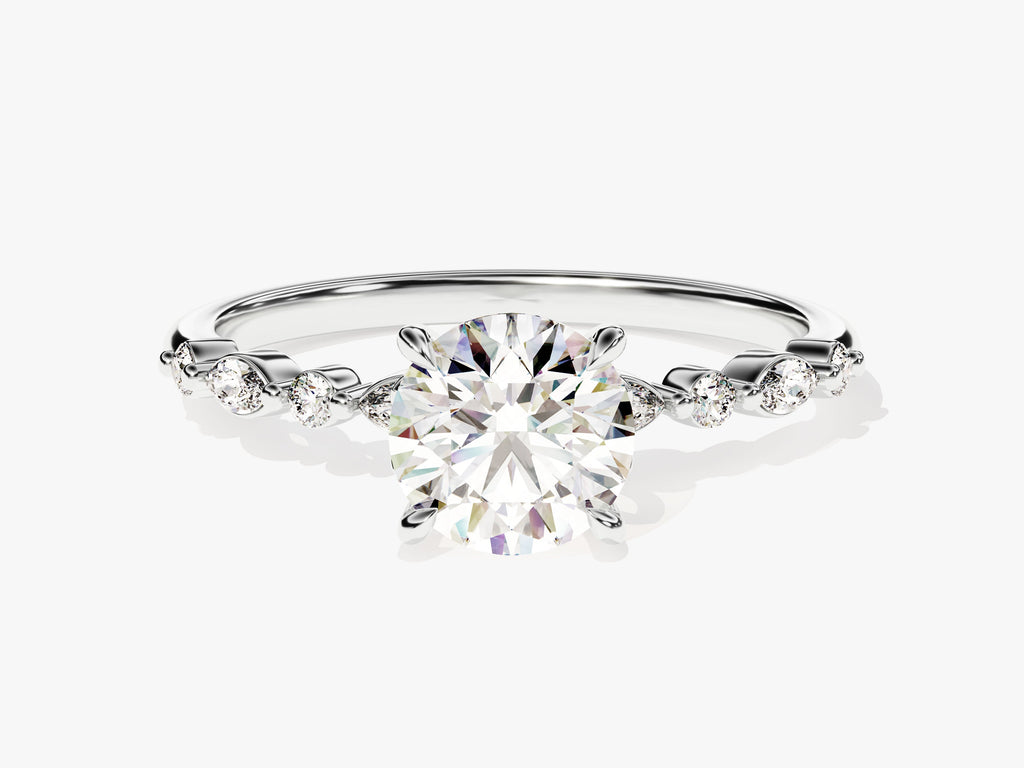 Fascinating and splendid, this lab grown diamond engagement ring in 14k white gold features sparkling side stones of 4 round and 4 marquise-shaped sparkling stones to complement your round center lab grown diamond.
