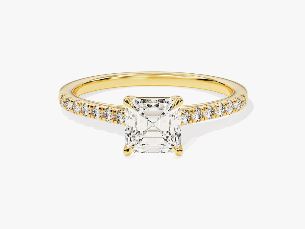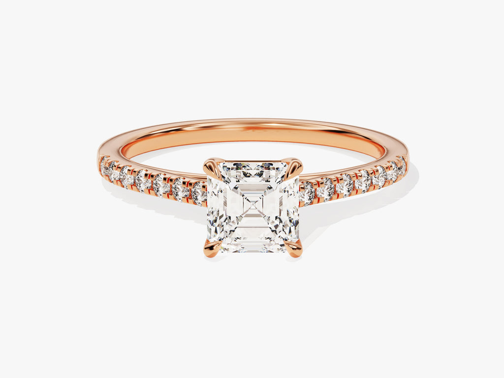 The Asscher Cut Moissanite Engagement Ring with Pave Set Side Stones is a stunning and timeless piece of jewelry designed for those looking to celebrate their love and commitment. This exquisite ring features a center stone cut in the elegant Asscher shape, known for its square shape with cropped corners and captivating facets that create a mesmerizing play of light.