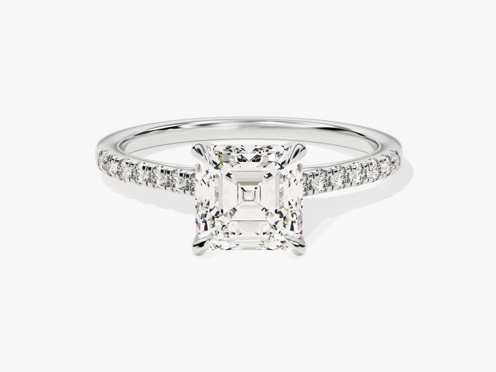 Introducing our Asscher Cut Diamond Engagement Ring with Pave Set Side Stones – a masterpiece of elegance. To enhance the beauty of the Asscher cut diamond, we've adorned the band with a delicate and dazzling pave setting. A stunning array of smaller diamonds elegantly encircle the main stone, adding an extra layer of brilliance and luxury to this already magnificent piece.