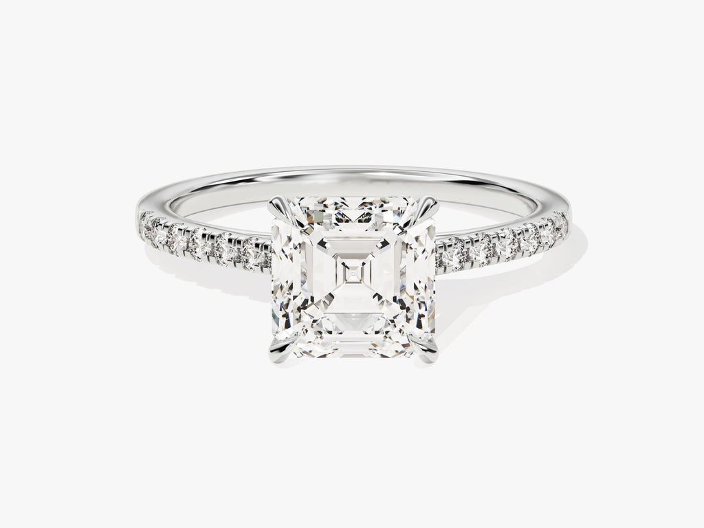 With our Asscher Cut Diamond Engagement Ring Pave Set Side Stones, you will make a statement about your love and style. It's a symbol of timeless love in a modern world. This exquisite ring features a center stone cut in the elegant Asscher shape, known for its square shape and captivating facets that create a dazzling play of light.