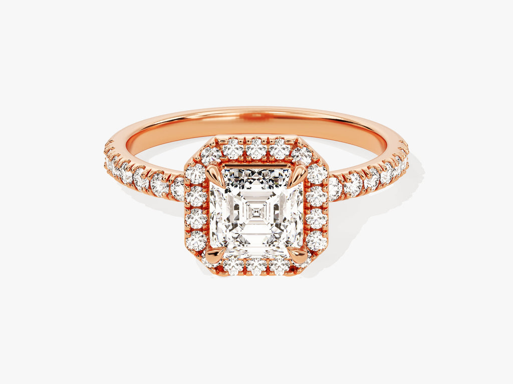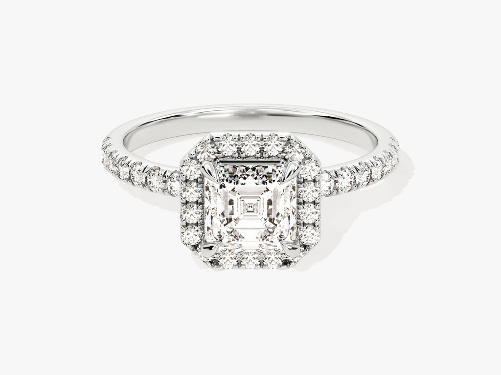 Introducing the epitome of elegance and ethical luxury - our Asscher Halo Lab Grown Diamond Engagement Ring with Pave Set Side Stones. This breathtaking ring beautifully marries the timeless charm of the Asscher cut diamond with the modern allure of a halo setting and pave side stones, creating a truly remarkable symbol of your love.