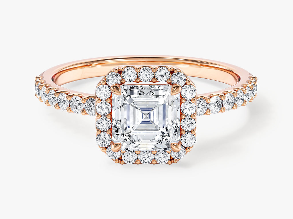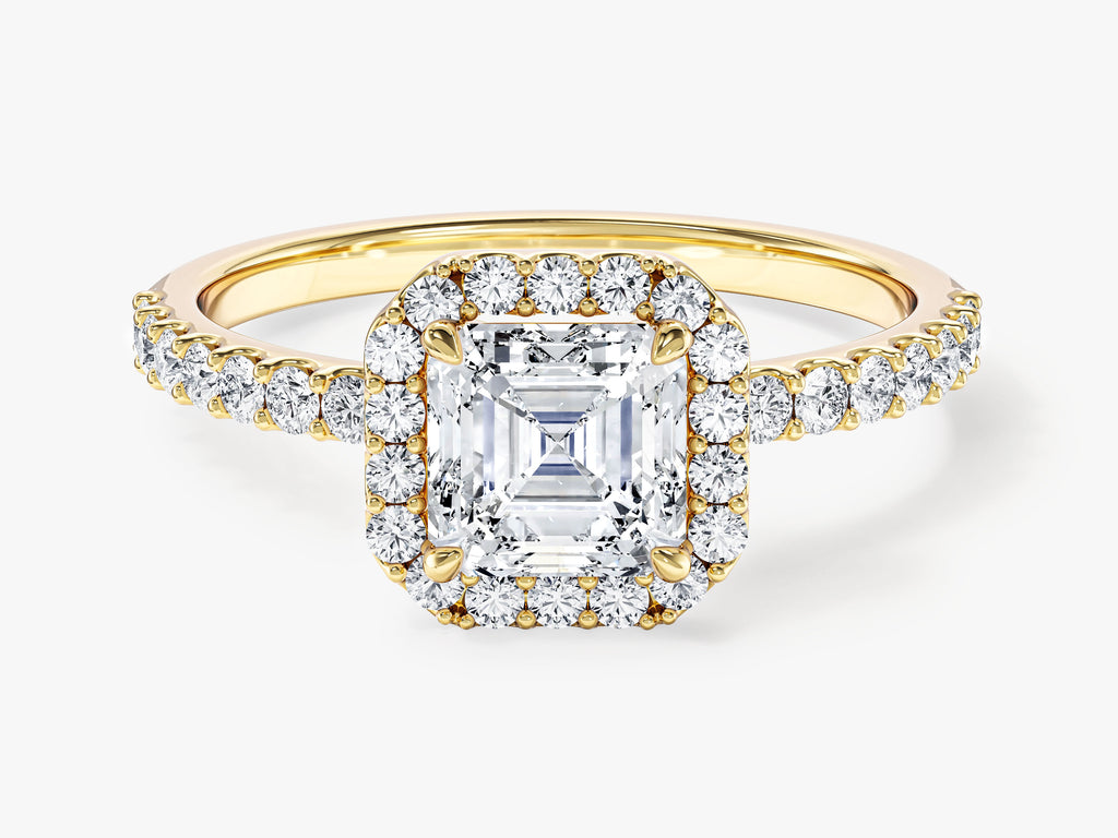 The Asscher Halo Moissanite Engagement Ring with Pave Set Side Stones is a luxurious symbol of love and commitment. This exquisite ring features a stunning Asscher-cut moissanite at its center, renowned for its captivating brilliance. What makes this ring truly exceptional is its halo setting, which encircles the central moissanite with a sparkling array of smaller stones. Additionally, the ring boasts pave set side stones, where tiny moissanites are meticulously set along the band, enhancing its overall radiance.