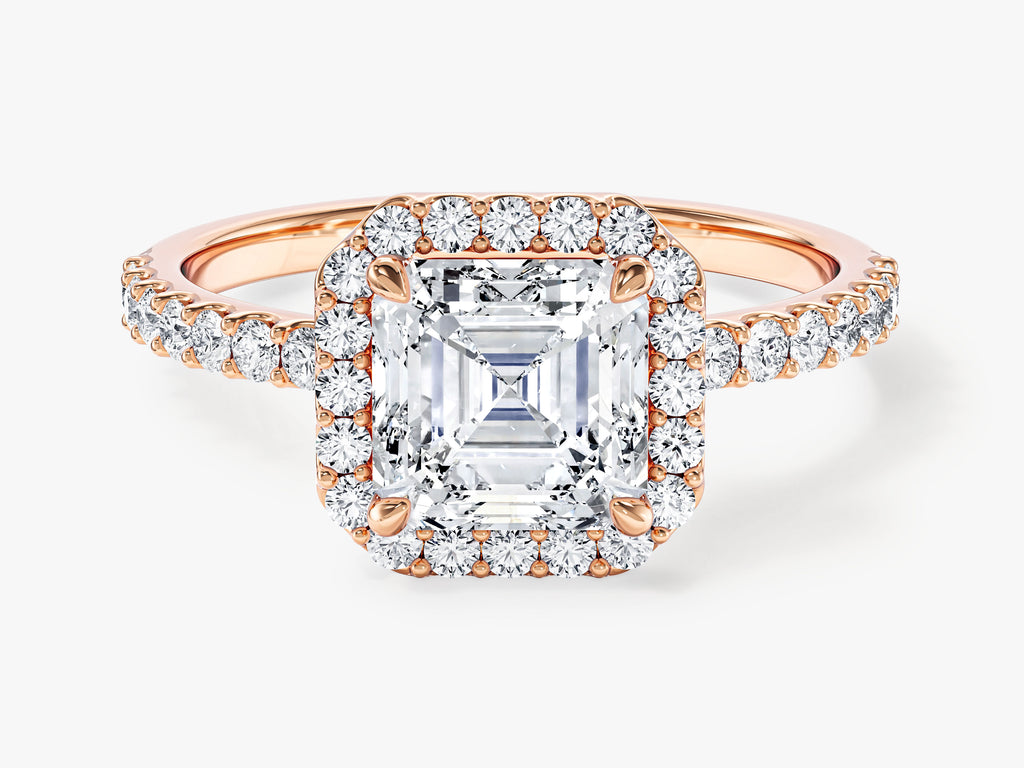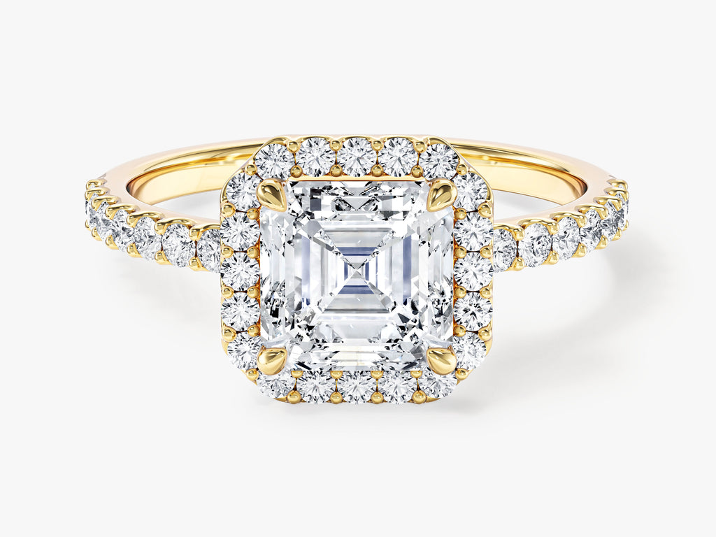 Unveil the ultimate symbol of love with our Asscher Halo Moissanite Engagement Ring adorned with Pave Set Side Stones. The mesmerizing 1.5-carat Asscher-cut moissanite at the heart of this ring is framed by a dazzling halo of glistening pave-set accent stones. The band further sparkles with additional side stones, creating a symphony of brilliance that will leave your beloved breathless.
