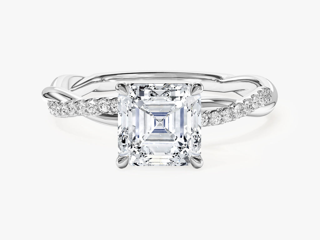 The Asscher Twisted Lab Grown Diamond Engagement Ring with Pave Set Side Stones features a stunning Asscher cut lab-grown diamond. The square-shaped facets of the Asscher cut to provide a unique and mesmerizing play of light, ensuring that your love shines brilliantly. The center diamond is gracefully embraced by a twisted band design, adding a touch of contemporary flair to the ring's classic appeal.