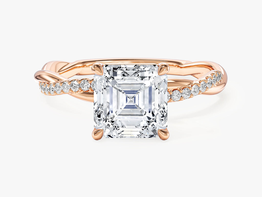 Choose the Asscher Twisted Lab Grown Diamond Engagement Ring with Pave Set Side Stones to mark the beginning of your lifelong journey together. The ring is adorned with a stunning Asscher cut lab-grown diamond at its heart. The center diamond is gracefully embraced by a twisted band design, adding a touch of sophistication and contemporary flair to the ring's classic design.