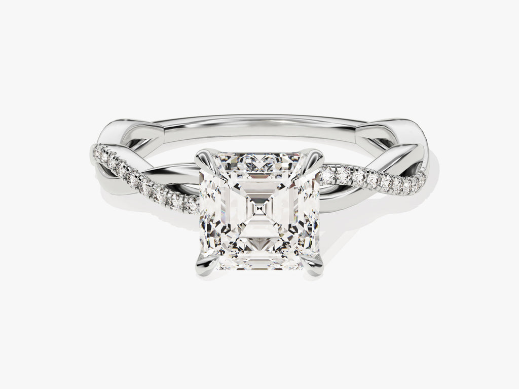 The Asscher Twisted Diamond Engagement Ring with Pave Set Side Stones features a stunning Asscher cut diamond. The square-shaped facets of the Asscher cut to provide a unique and mesmerizing play of light, ensuring that your love shines brilliantly. The center diamond is gracefully embraced by a twisted band design, adding a touch of contemporary flair to the ring's classic appeal.
