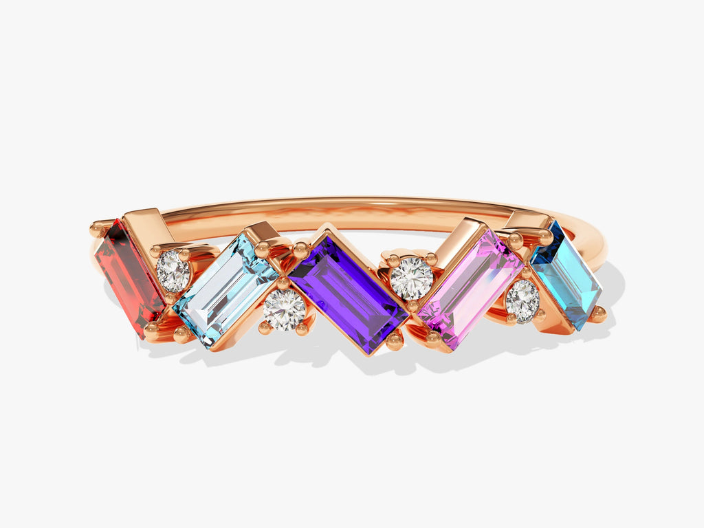 This unique ring is a perfect interpretation of modern and classic styles. The chevron-shaped arrangement of baguette-cut birthstones, accented by sparkling diamonds in between, creates an eye-catching design never seen before. Choose your favorite birthstone to add your personal touch and make this ring truly one-of-a-kind. It's a piece of jewelry that's made just for you or someone you want to express your love to.