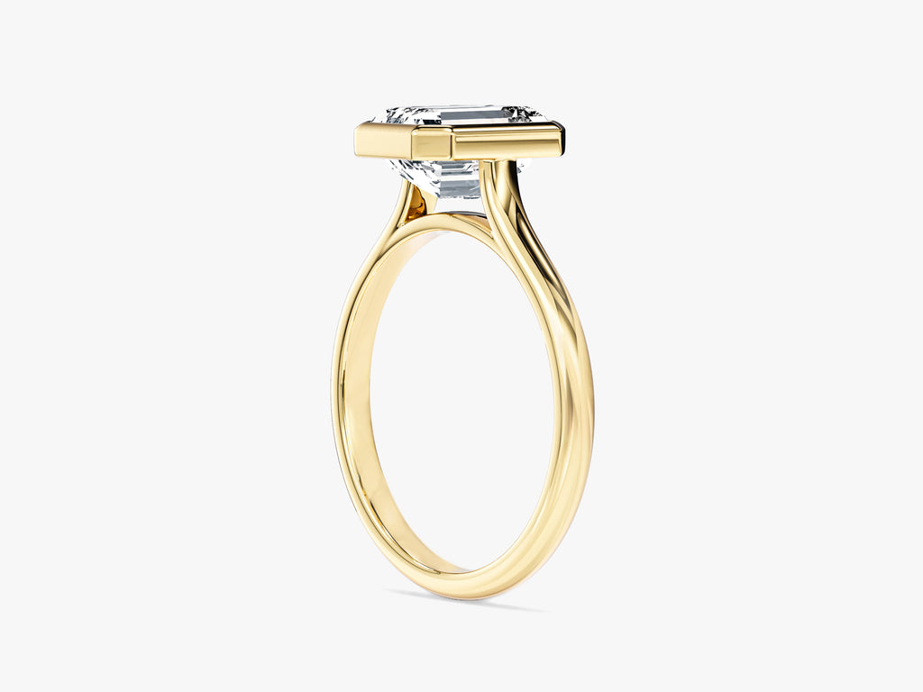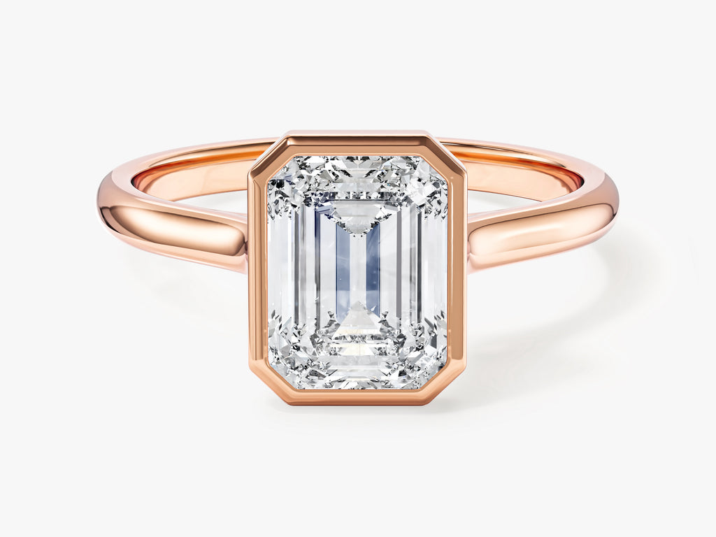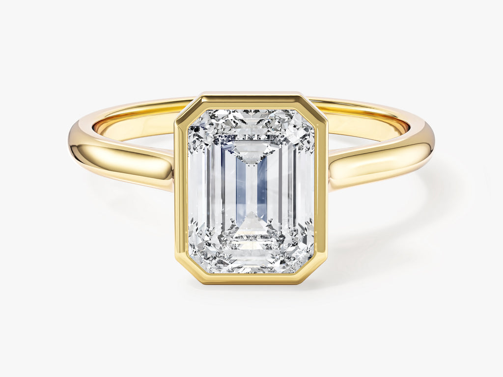Bezel Emerald Lab Grown Diamond Engagement Ring is a timeless emblem of your commitment that will be cherished for a lifetime. This ring showcases the pure elegance of an emerald cut lab grown diamond, meticulously crafted to emphasize its remarkable clarity and distinct allure.