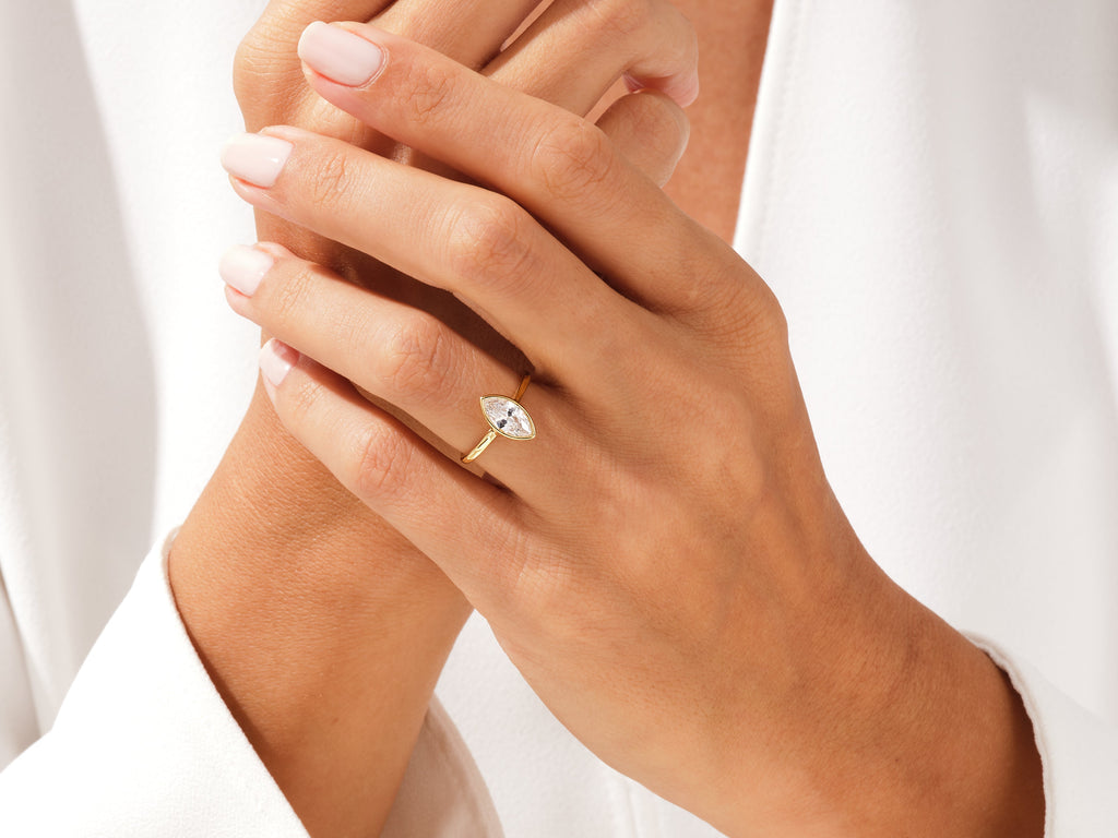 Select the Bezel Marquise Diamond Solitaire Engagement Ring to symbolize your enduring love and dedication. This ring spotlights a stunning marquise-cut diamond, expertly crafted to emphasize its exceptional clarity and unique allure.