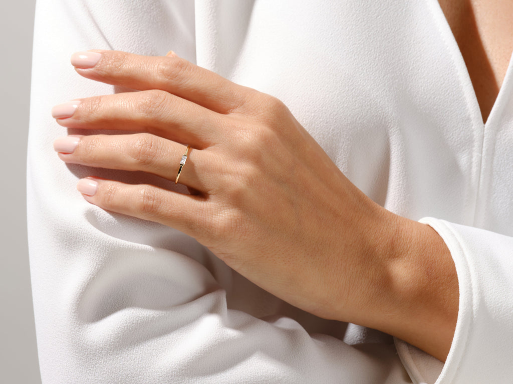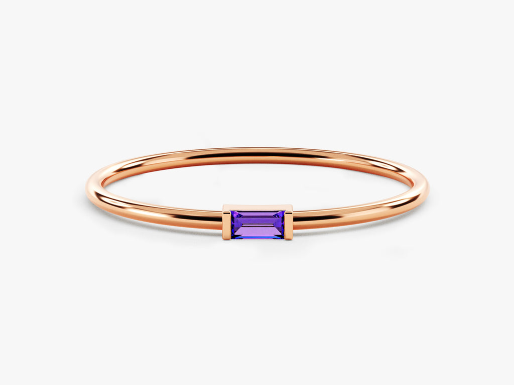 The Bezel Set Baguette Birthstone Ring features a sleek and modern design, showcasing a baguette-cut birthstone elegantly encased in a bezel setting. Its minimalist style highlights the beauty of the stone, making it a versatile and timeless piece. Personalize it with your chosen birthstone for a meaningful accessory or a thoughtful gift.