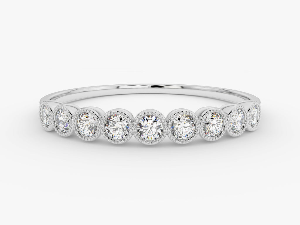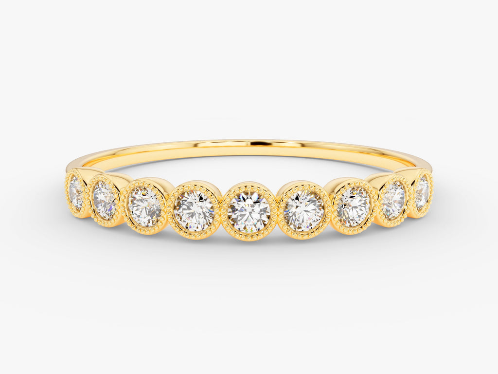 Brilliant round diamonds that are placed securely back to back in bezel settings sparkle halfway around the band. The gold milgrain detailing adds texture and dimension to this lovely band. Whether you're saying "I do" or simply celebrating the milestones along the way, this band is just the perfect companion.