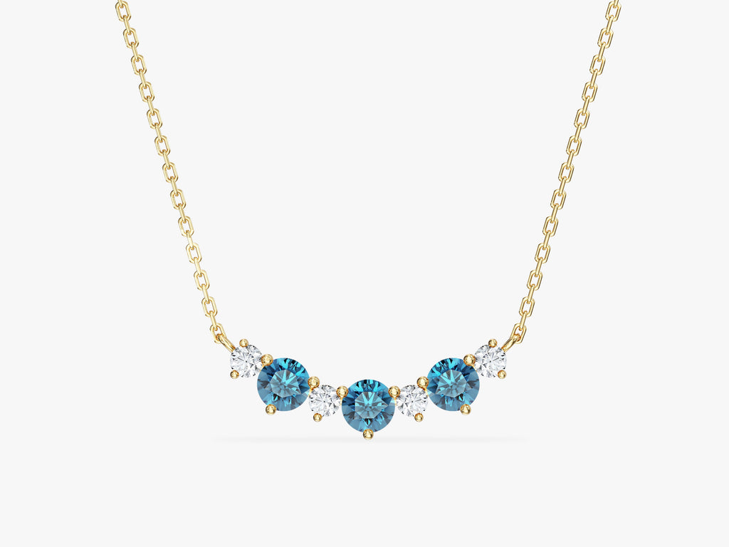 The Birthstone Trio Prong Necklace with seven stones features a stunning design where three of the birthstones are larger and positioned at the center with four smaller stones. This striking necklace creates a balanced and elegant look. Combining varying stone sizes adds depth and dimension, making it a meaningful and eye-catching piece perfect for special occasions or everyday wear.