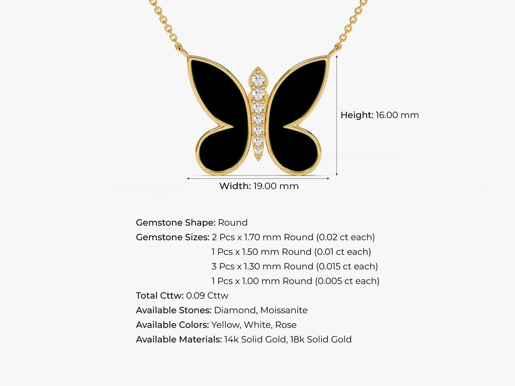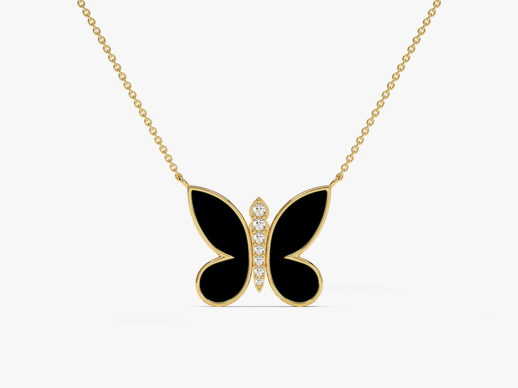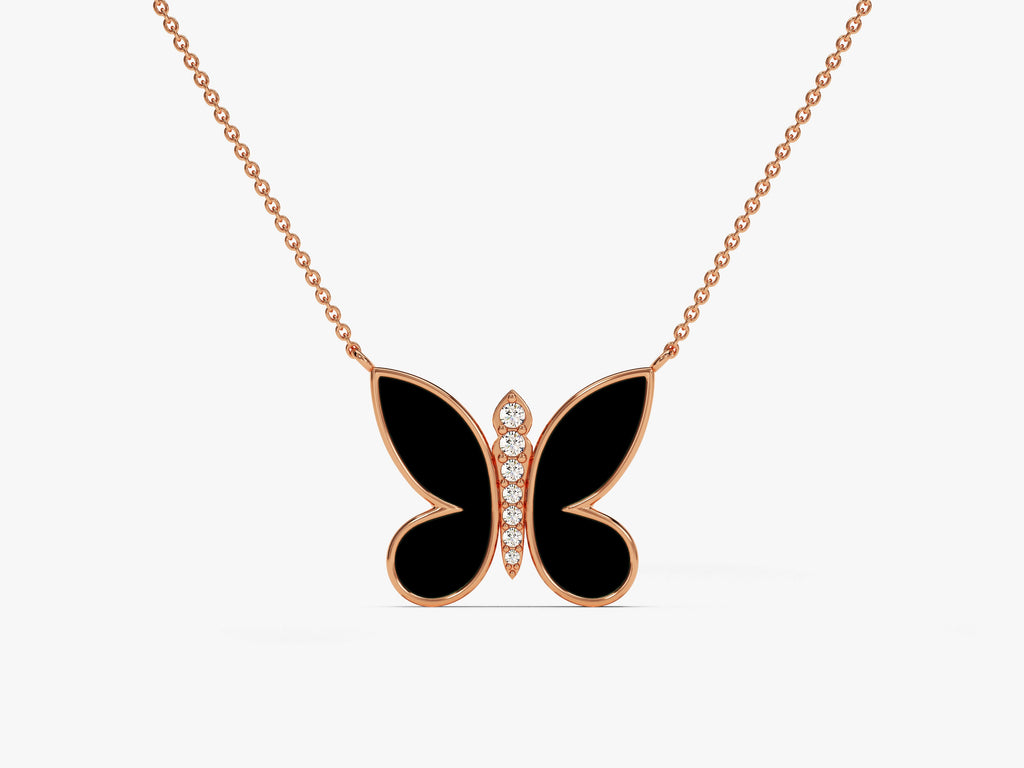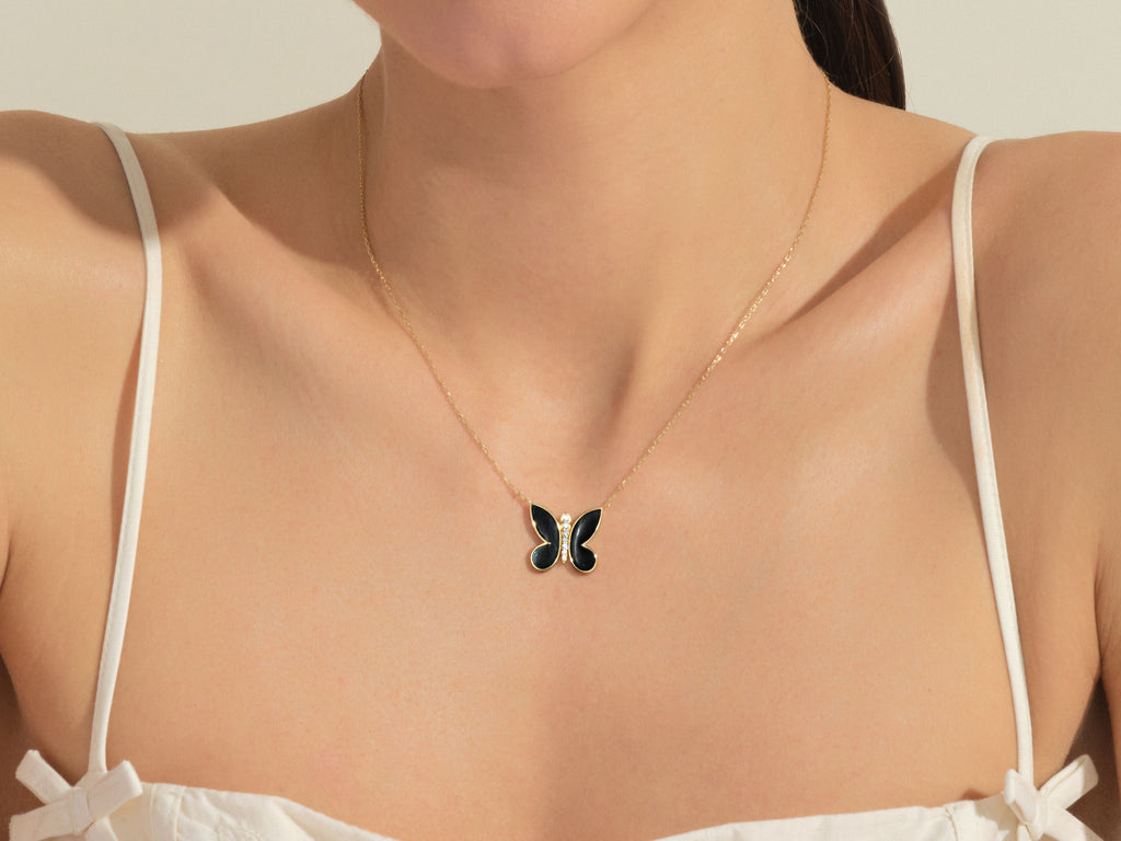 This necklace features a beautifully crafted butterfly pendant made from solid gold, gold vermeil or sterling silver and adorned with black enamel, adding bold contrast and contemporary flair—the combination of black enamel and the sparkle results in a sophisticated, modern, and timeless design.