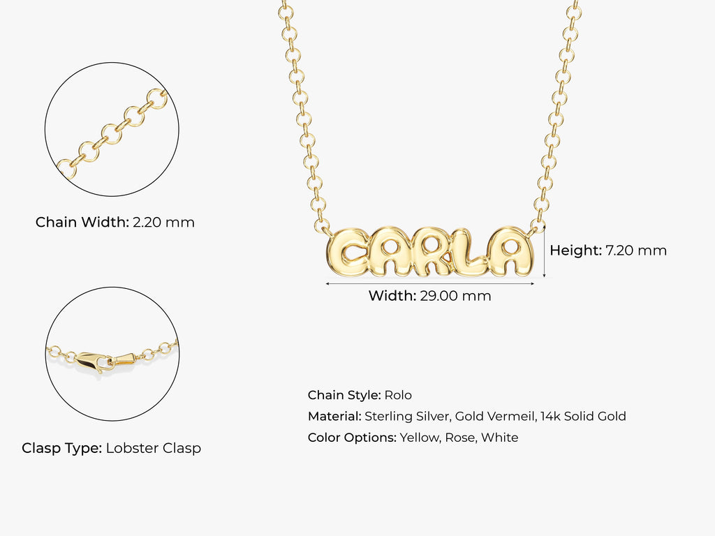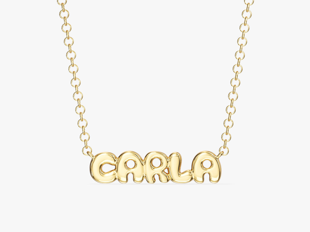 The Bubble Name Necklace is a personalized and stylish accessory. Crafted from solid gold, gold vermeil or sterling silver. It features a chain with an individual bubble-shaped pendant with letters to spell out a name or word of your choice.