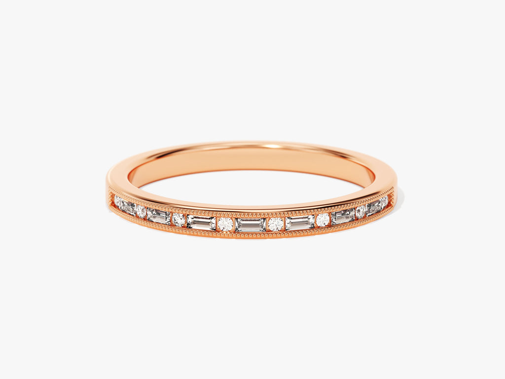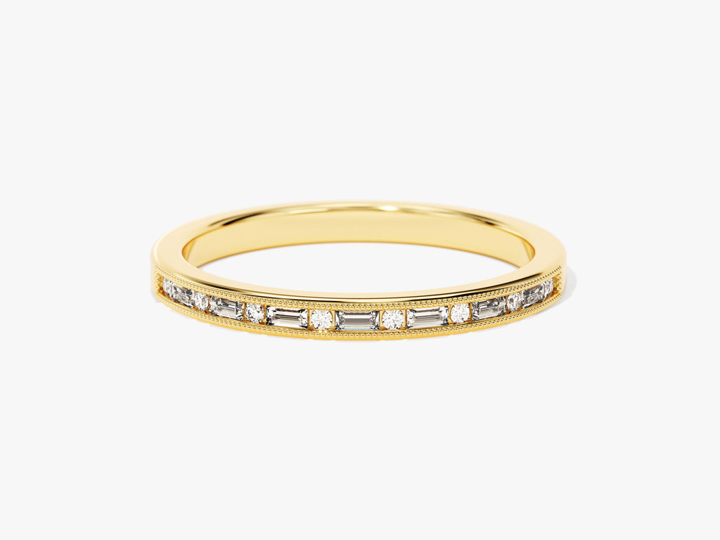 Experience the captivating charm of Eternate's Channel Set Baguette and Round Ring. Meticulously crafted from gold vermeil, sterling silver or solid gold, this ring features a stunning arrangement of horizontal baguette and round-cut diamonds - moissanite, creating a balanced and refined piece. Whether chosen for its unique appeal or as a statement accessory, its beauty adds a touch of sophistication and brilliance to your ensemble, capturing attention with its exquisite arrangement.
