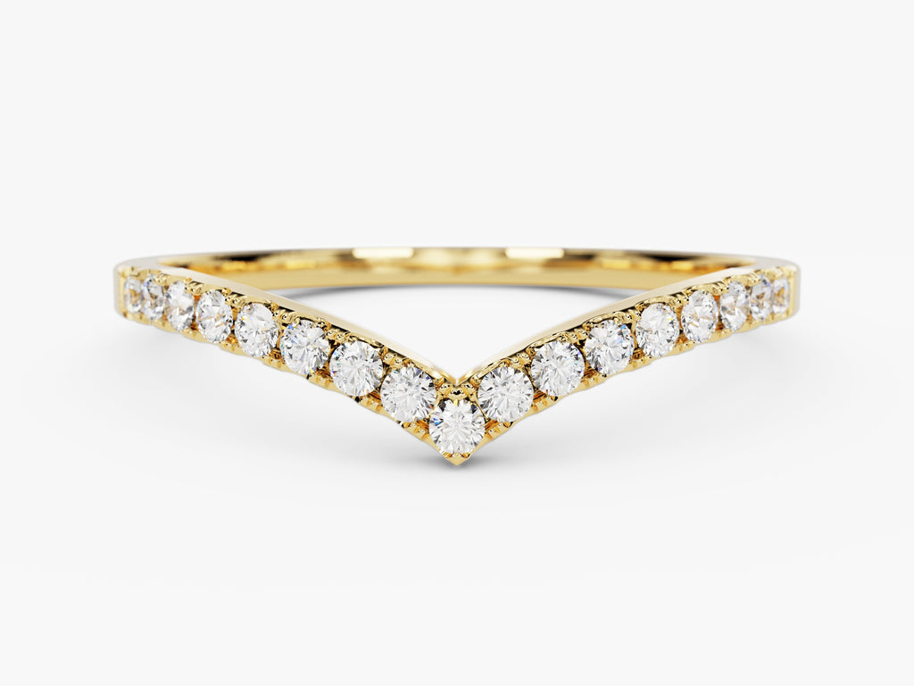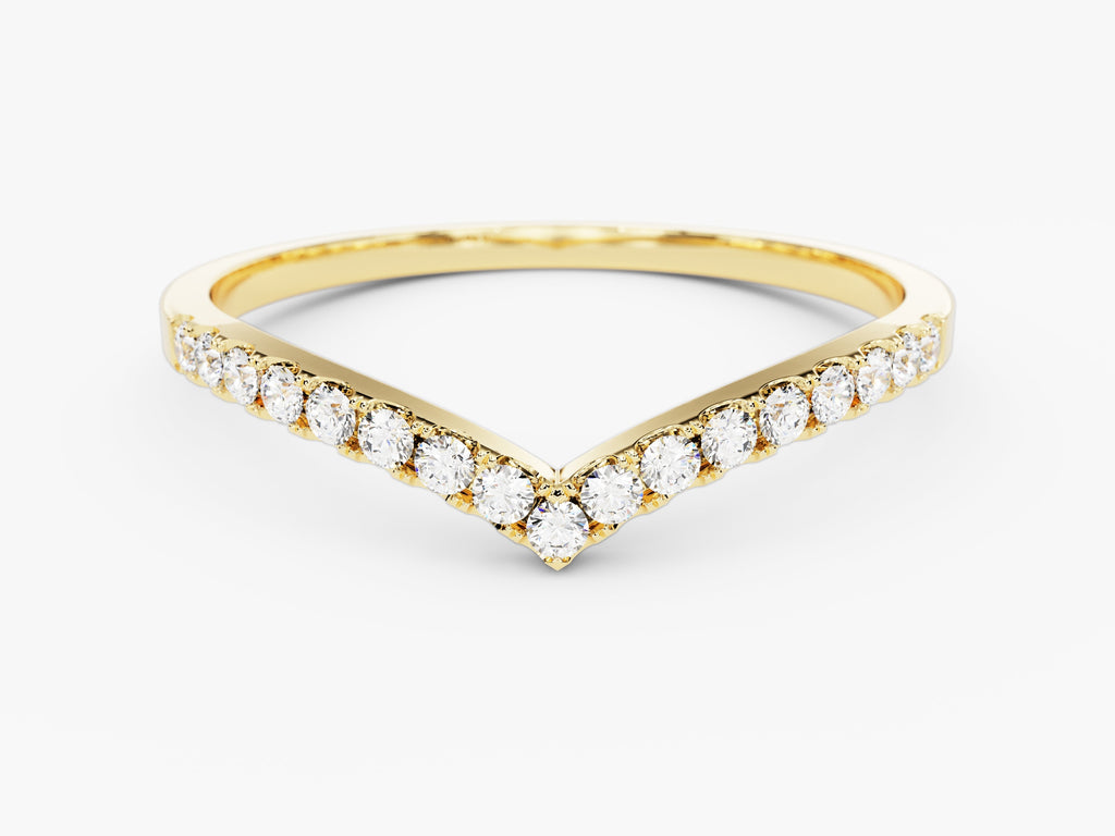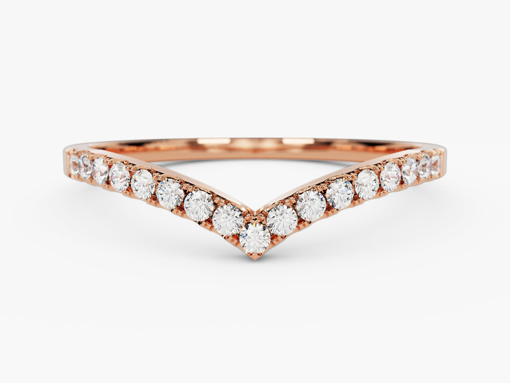 Each sparkling moissanite stone is expertly set within the chevron pattern which creates a dazzling display of brilliance and beauty. The gentle curve lets your engagement ring sit perfectly alongside it like they were meant to be together. With this exquisite band, let your love shine bright for all to see.