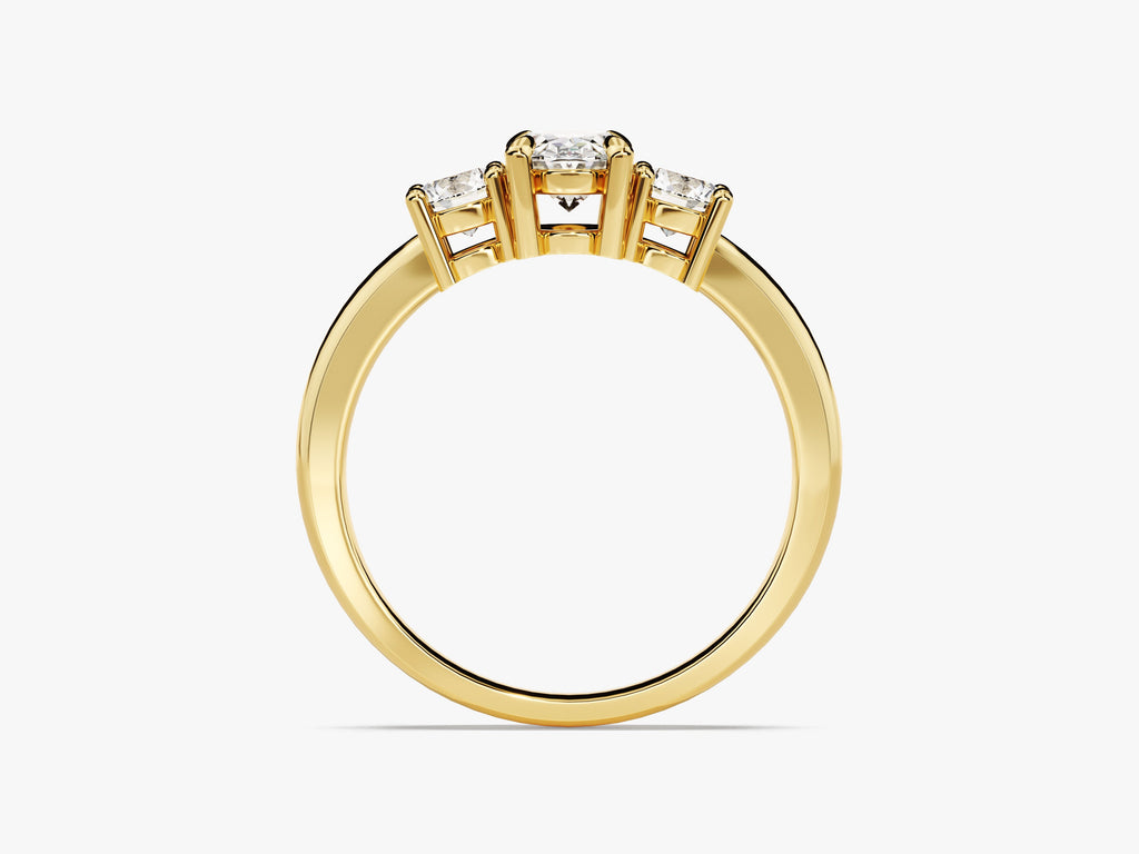 Perfect and graceful, this moissanite engagement ring in 14k gold features two brilliant side stones to complement your oval-shaped center stone.