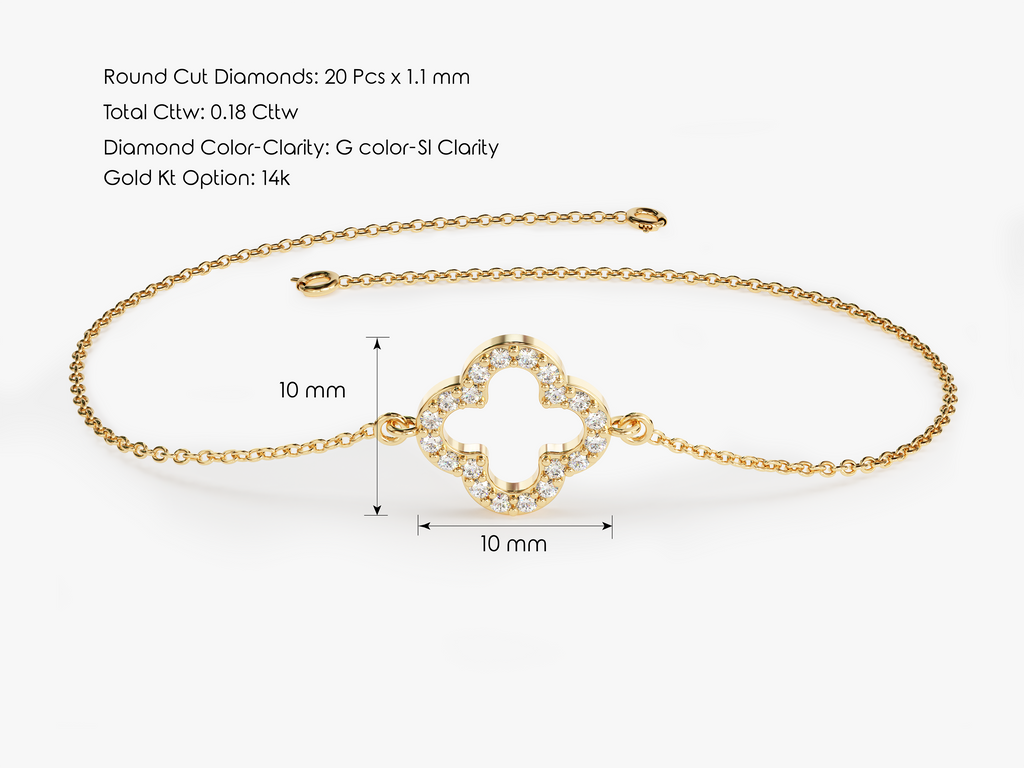 This elegant and perfectly-proportioned clover bracelet features 0.18 ct of brilliant cut round diamonds or moissanite. Equally stunning from every angle, it's the ideal gift for an anniversary, a graduation, a birthday or any special occasion. Please feel free to contact us for different sizes and further info.