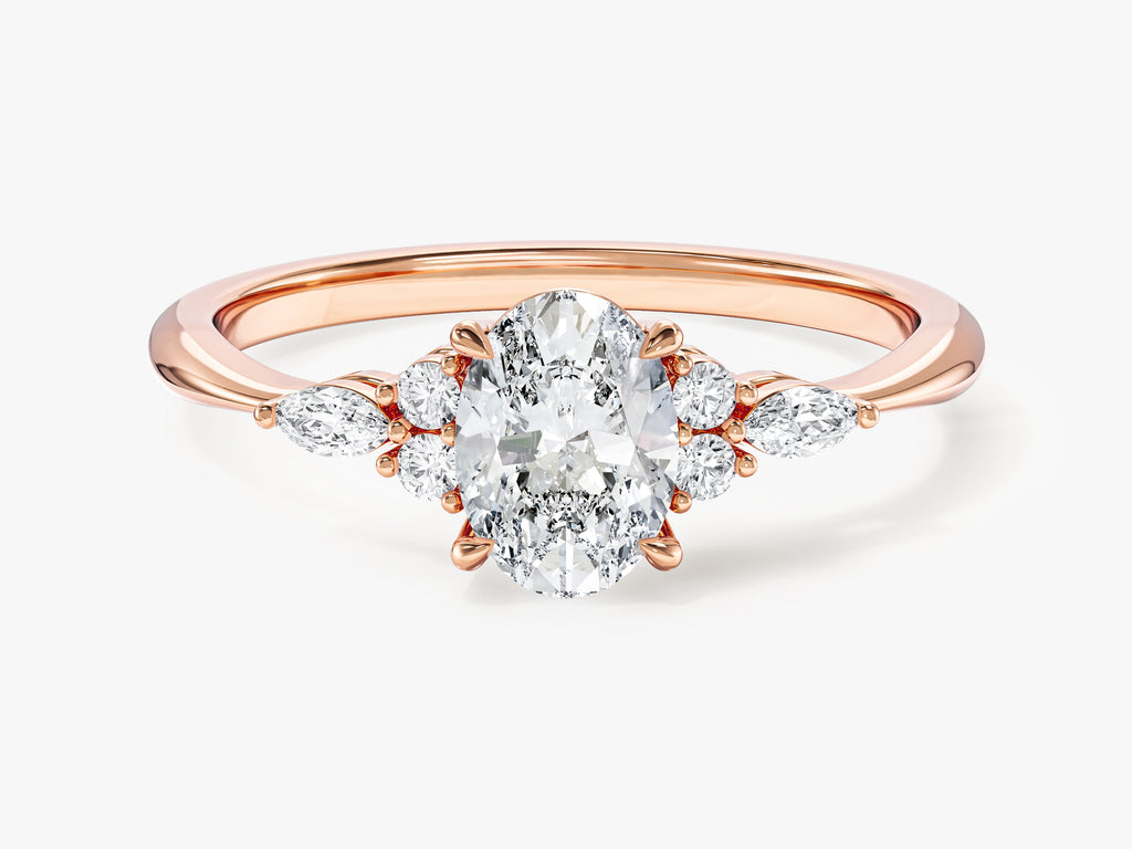 Beautiful and luring, this lab grown diamond engagement ring in 14k gold features a cluster of 4 round and 2 marquise-shaped sparkling stones to complement your oval-shaped center stone.
