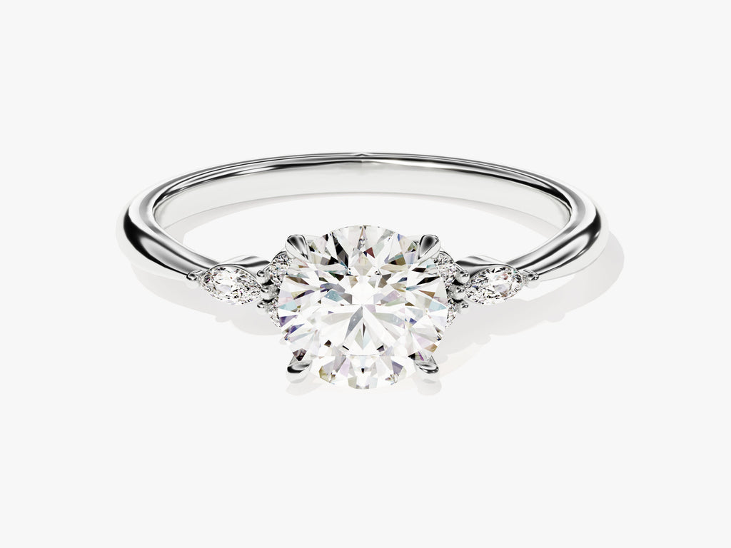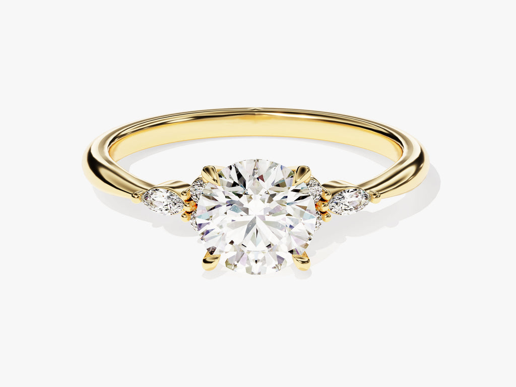 Glorious and radiant, this moissanite engagement ring in 14k gold features a cluster of 4 round and 2 marquise-shaped sparkling stones to complement your round center stone.