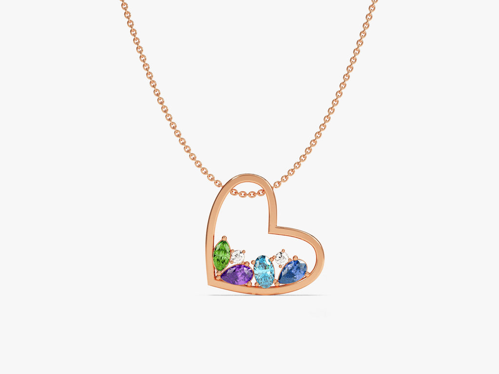 Our heart-shaped pendant, delicate and dainty, has a design as unique as the person who wears it. This customizable birthstone necklace features a hollow heart design that’s adorned with marquise, oval and pear-shaped birthstones with tiny sparkling diamonds among them. Whether it's your birthstone, a friend's or a loved one's, this necklace is a beautiful way to carry a piece of their heart with you.