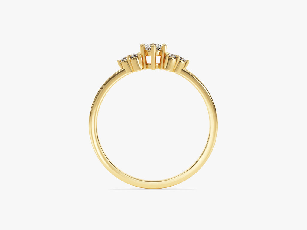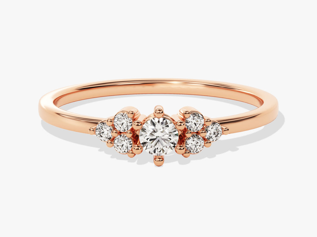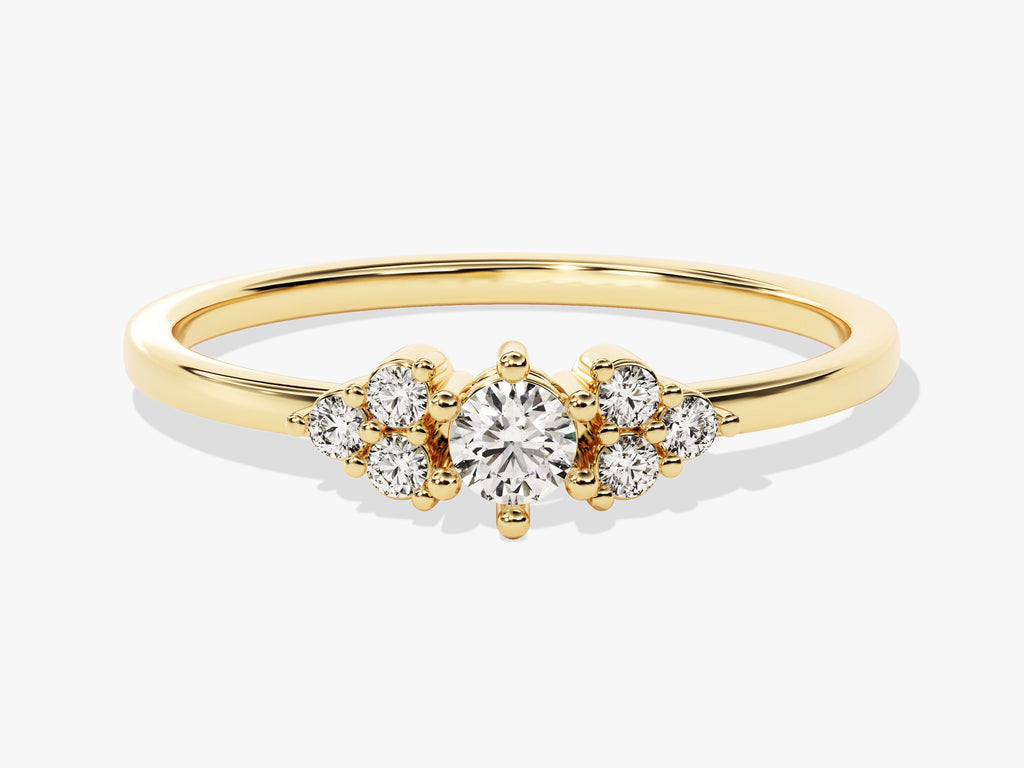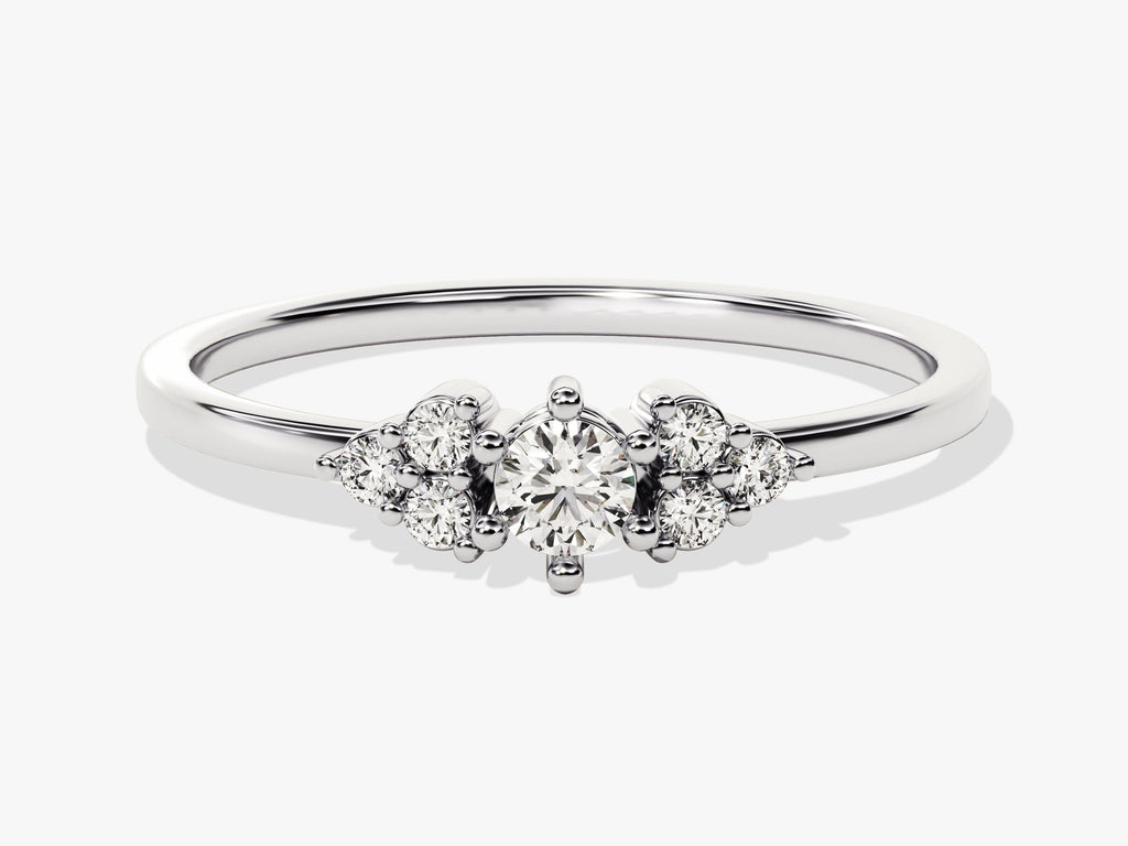This engagement ring features a brilliant round center moissanite, surrounded by a cluster of sparkling moissanites in an elegant floral design. A unique and timeless piece that embodies beauty and sophistication.