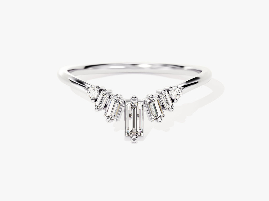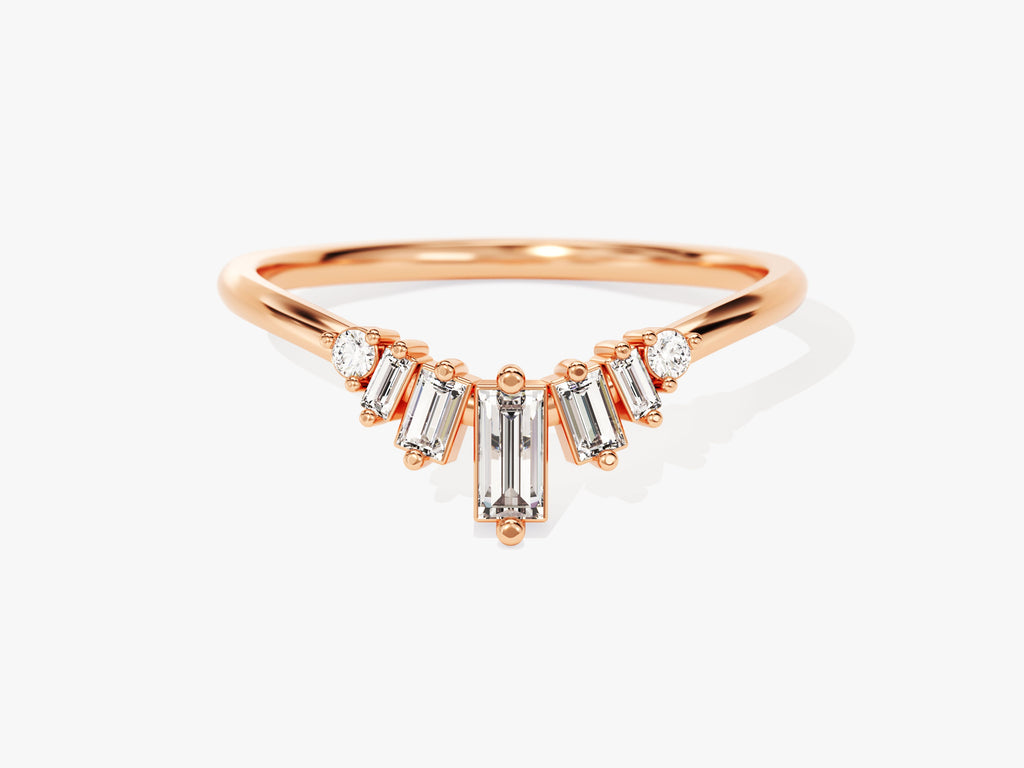 Discover the graceful elegance of our Curved Baguette Ring. Meticulously crafted from gold vermeil, sterling silver or solid gold. This ring features a curved V-shaped design adorned with exquisite diamonds - moissanite, creating a captivating and stylish piece. Whether chosen for its modern appeal or as a statement accessory, its refined beauty adds a touch of sophistication and brilliance to your ensemble, capturing attention with its unique and chic silhouette.