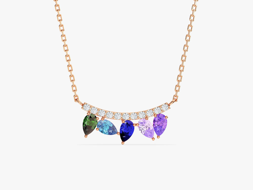 The Curved Pear Birthstone Necklace showcases a sleek, curved design adorned with up to 5 customizable pear-shaped birthstones. Delicate yet striking, this piece is a beautiful way to celebrate family, friendship, or meaningful moments with a personalized touch.