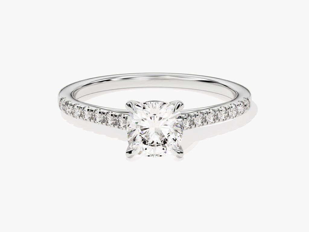 Explore our exquisite Cushion Cut Lab Grown Diamond Engagement Ring with Pave Set Side Stones. This splendid ring showcases a brilliant cushion-cut lab-grown diamond, carefully designed to enhance its remarkable clarity and captivating allure. The delicate pave setting, adorned with ethically sourced side stones, adds an extra layer of brilliance.
