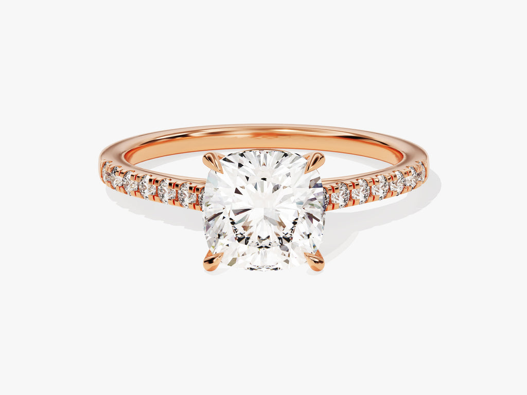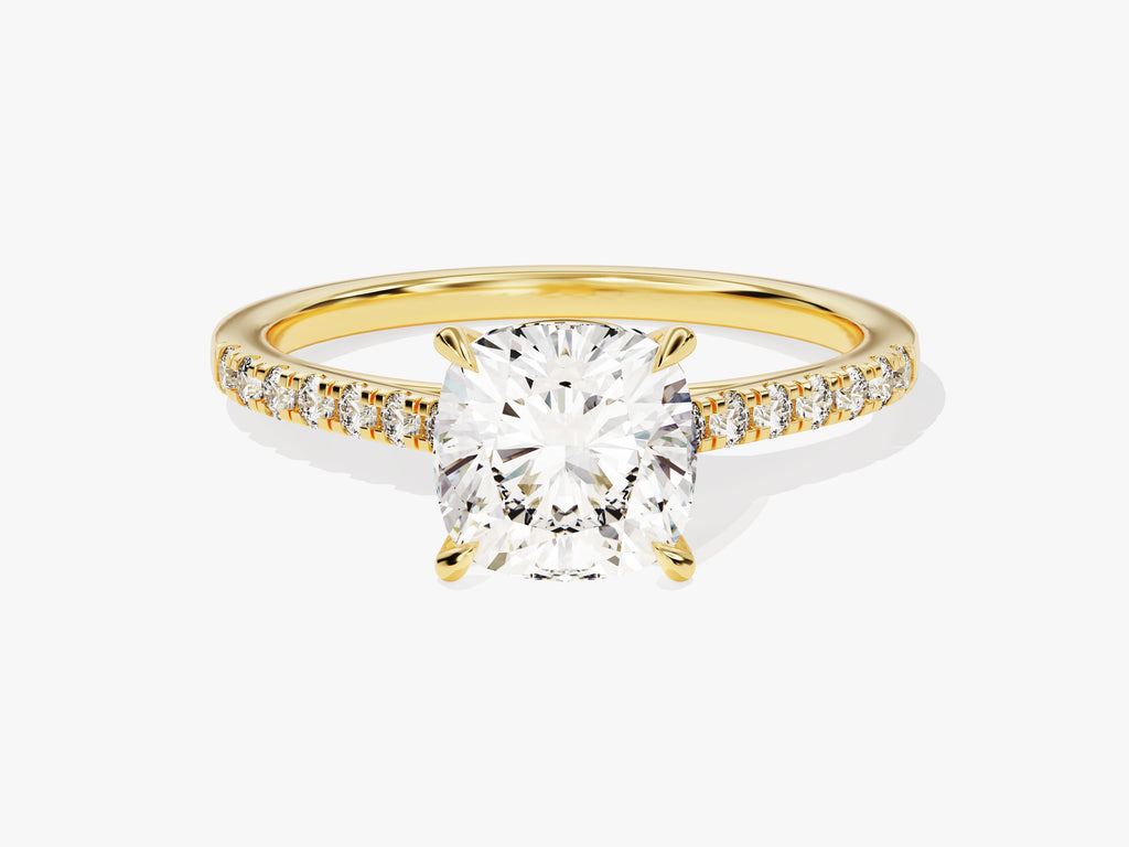 Declare your love with the unmatched sparkle of our Cushion Cut Moissanite Engagement Ring adorned with Pave Set Side Stones. This extraordinary ring features a stunning cushion-cut moissanite as its centerpiece, radiating brilliance and charm. The moissanite is beautifully accented by smaller stones, meticulously set in a pave style, enhancing the overall shimmer and allure.