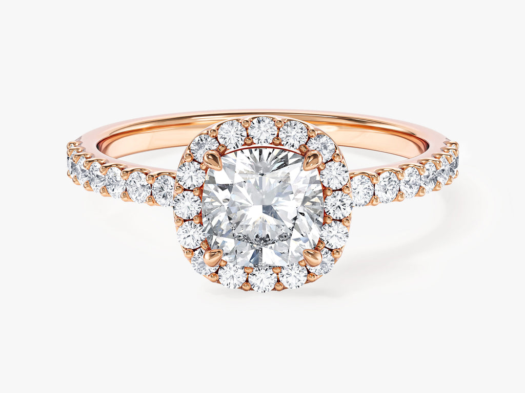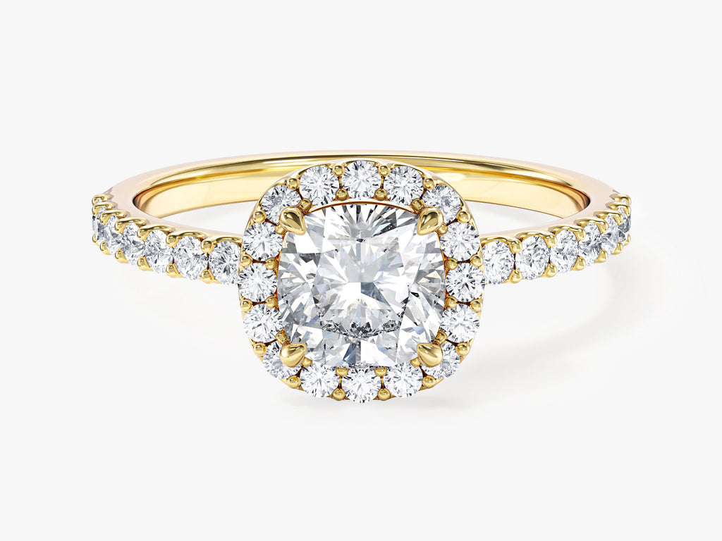 Behold the splendor of our Cushion Halo Lab Grown Diamond Engagement Ring with Pave Set Side Stones, a masterpiece that marries classical opulence with a modern touch. This exquisite ring features a brilliant cushion-cut lab-grown diamond, crafted to enhance its clarity and charm. Encircling the center stone, a delicate halo of lab-grown diamonds creates an aura of elegance while the meticulously set side stones on the band add an extra layer of brilliance.