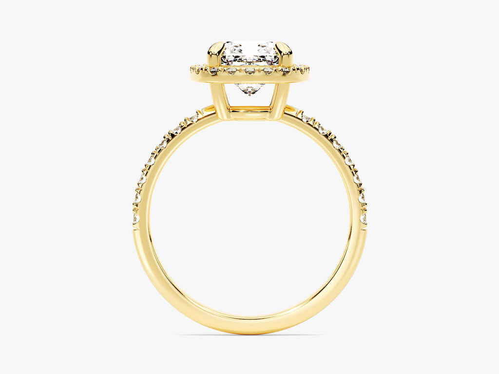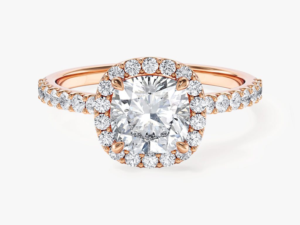 Discover the epitome of luxury and radiance with our Cushion Halo Moissanite Engagement Ring featuring Pave Set Side Stones. This exquisite ring showcases a dazzling cushion-cut moissanite at its center, known for its mesmerizing sparkle. It's elegantly framed by a halo of smaller moissanite stones, each meticulously set in a pave style to create a captivating display of shimmer and opulence. Along the band, tiny moissanites are meticulously set, adding an extra layer of sparkle to the ring.