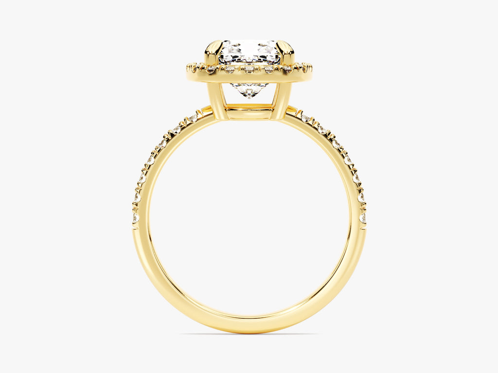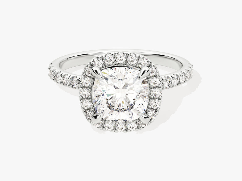 Elevate your proposal with the unmatched beauty of our Cushion Halo Moissanite Engagement Ring with Pave Set Side Stones. This extraordinary ring features a striking cushion-cut moissanite as its centerpiece, renowned for its brilliance and allure. The moissanite is gracefully encircled by a halo of smaller stones, meticulously set in a pave style, creating a captivating display of sparkle and opulence.