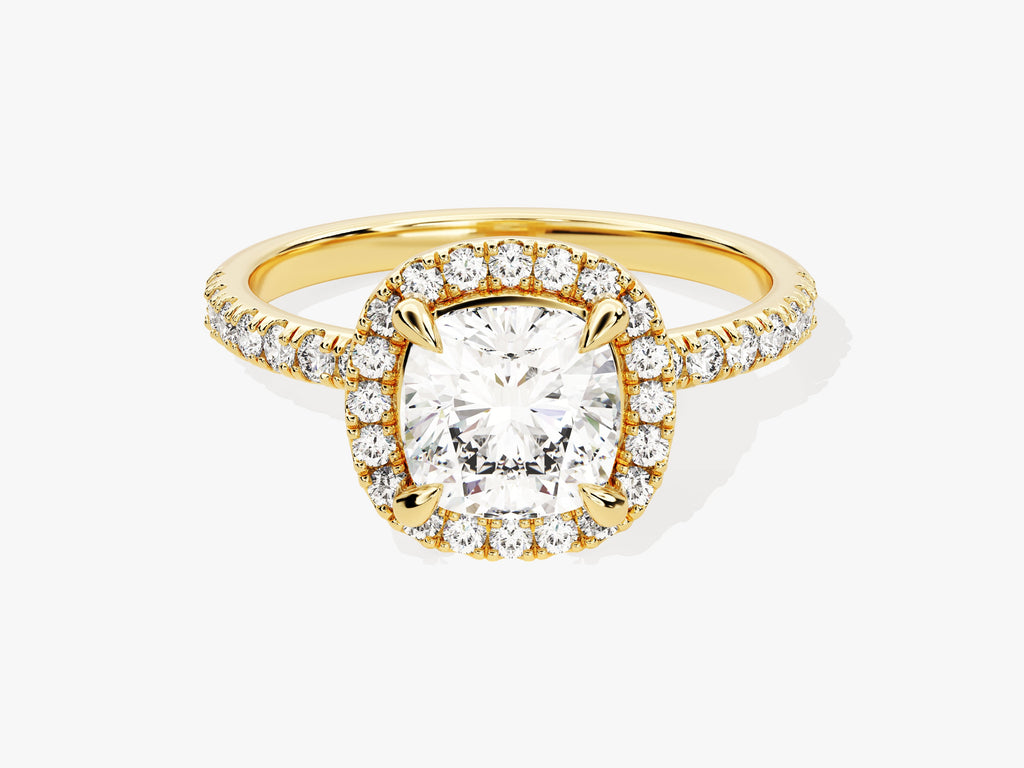Our Cushion Halo Diamond Engagement Ring featuring Pave Set Side Stones is an embodiment of timeless allure and contemporary sophistication. At its core, a dazzling cushion-cut diamond, encircled by a dazzling halo, takes center stage, designed to captivate with its remarkable clarity and distinctive allure. The band, adorned with meticulously set pave side stones, adds an extra layer of shimmer and elegance to the ring,