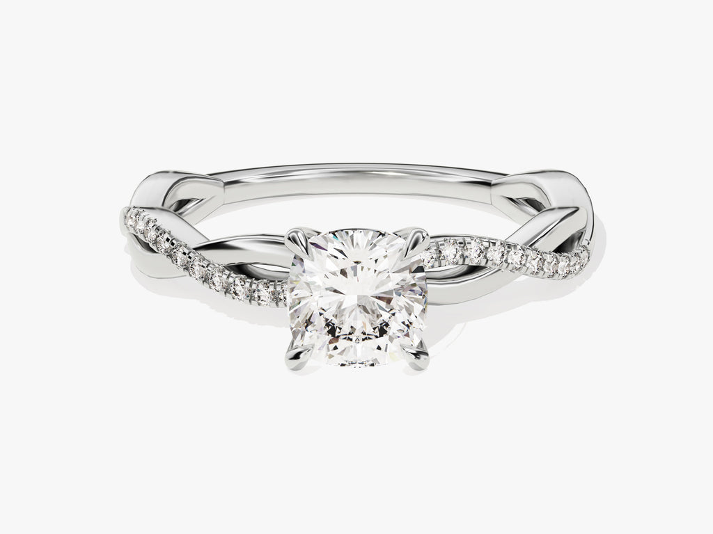 Our Cushion Twisted Lab Grown Diamond Engagement Ring with Pave Set Side Stones features a brilliant cushion-cut lab-grown diamond, expertly crafted to enhance its exceptional clarity and captivating charm. The unique and modern twisted band design symbolizes the intricate journey of your love. The meticulously set pave side stones on the band add an extra layer of brilliance and opulence to the design.