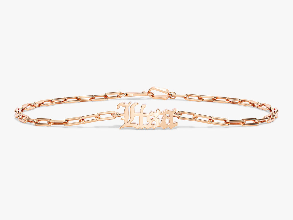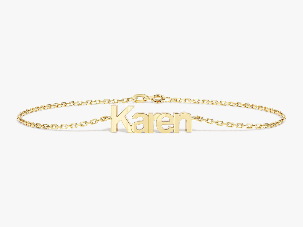 This custom name bracelet is a romantic and elegant way to show off your name. It's durable chain makes this piece of jewelry perfect for everyday wear or a special outing. It also comes in yellow, rose or white gold!
