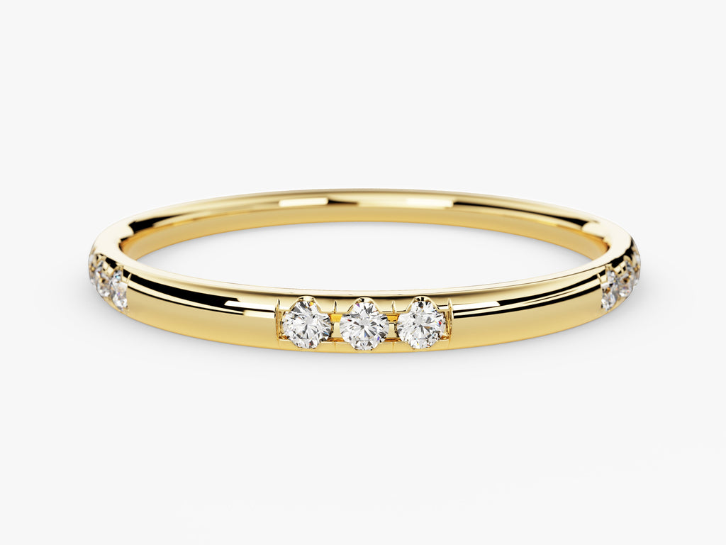 The three set of three diamonds catch the light to set off the beauty of its small diamonds. It looks great as an everyday ring or dressed up for special occasions. Say "forever" with grace and style with this dainty nine-stone diamond band.
