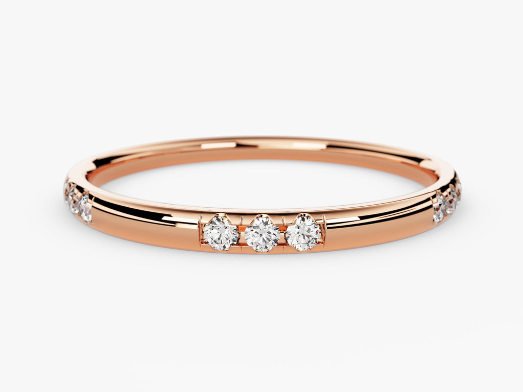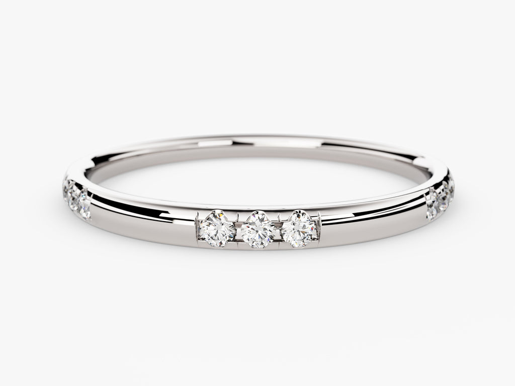 The three set of three diamonds catch the light to set off the beauty of its small diamonds. It looks great as an everyday ring or dressed up for special occasions. Say "forever" with grace and style with this dainty nine-stone diamond band.