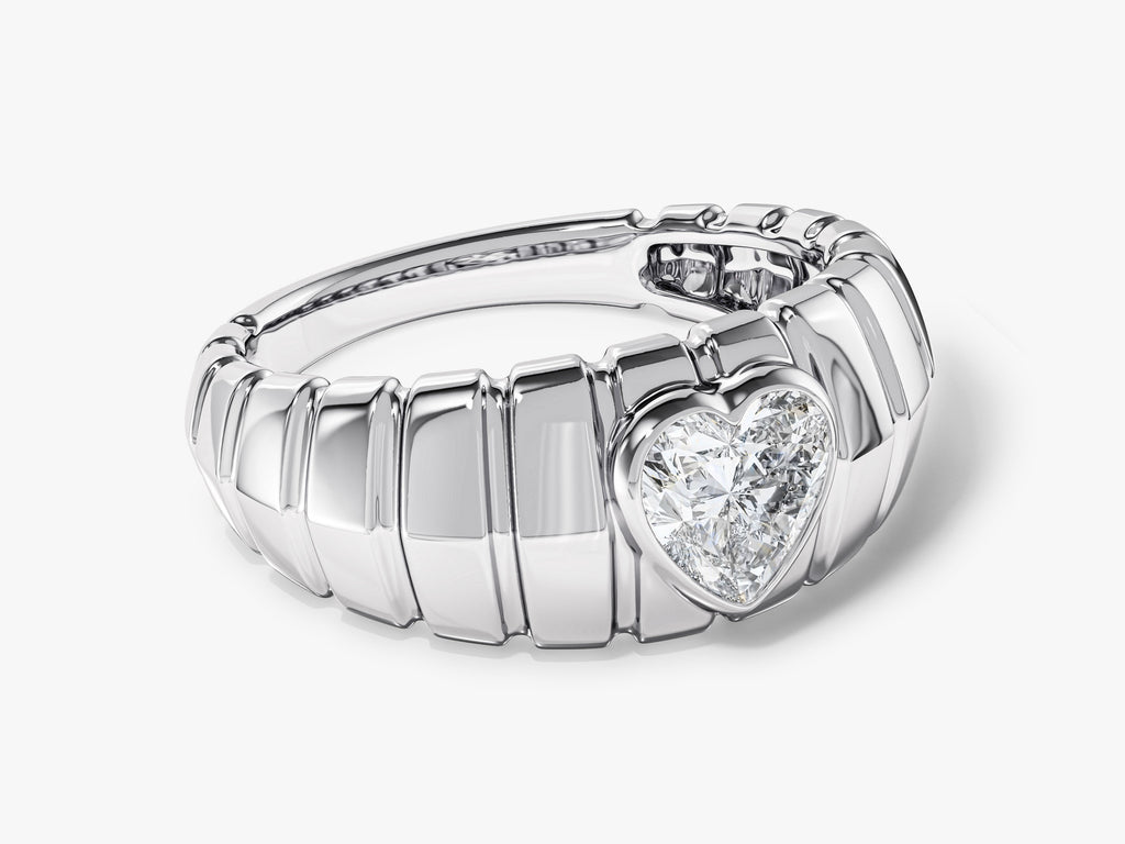 Modern yet romantic, this design blends sculptural form with heartfelt detail. A smooth dome band curves gracefully around a luminous heart-shaped center, striking the perfect balance between strength and sentiment. Minimalist in style yet rich in meaning, it embodies contemporary love with a bold, refined elegance.