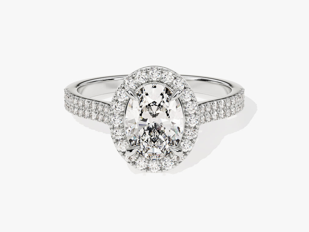 Elevate your love story with our Double Shank Oval Halo Moissanite Engagement Ring. This exquisite ring features a dazzling oval-cut moissanite center stone, celebrated for its brilliance and grace. It is gracefully encircled by a halo of smaller moissanite stones, creating a radiant display of shimmer and opulence. The double shank band adds a touch of unique sophistication, making this ring a symbol of your enduring love.