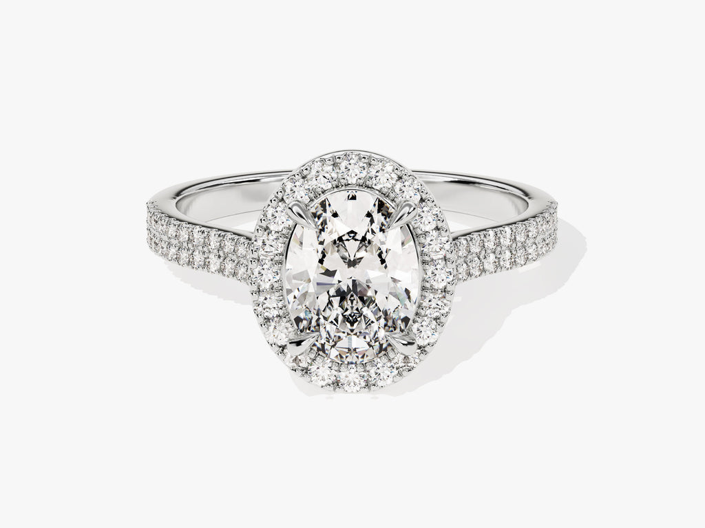 Elevate your love story with the Double Shank Oval Halo Diamond Engagement Ring. At its core, a dazzling oval-cut diamond takes center stage, designed to captivate with its distinctive allure. The double shank design adds a modern twist to the ring, symbolizing the intertwining journey of your love. A delicate halo diamonds encircles the center stone, while the meticulously set diamonds on the band add an extra layer of sophistication.