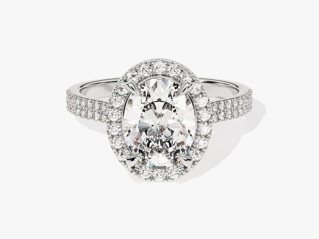 Opt for our Double Shank Oval Halo Diamond Engagement Ring to symbolize your love story, ensuring your symbol of love is treasured for generations to come. The star of this design is a stunning oval-cut diamond, meticulously created to emphasize its remarkable clarity and captivating beauty. The double shank design and the dazzling halo add a contemporary and refined touch, symbolizing the unique path of your love.